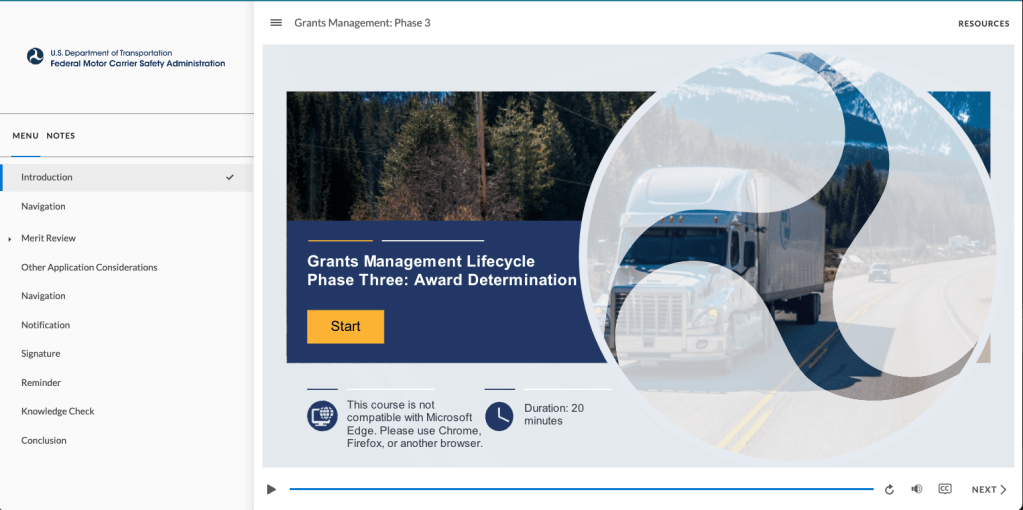 The Grants Management project required working with FMCSA officials spread across the United States to incorporate the breadth and depth of knowledge needed for this curriculum.