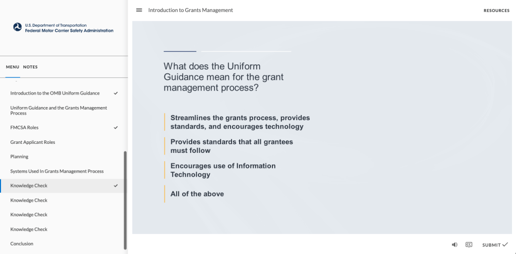 It’s rare that I get a chance to share what I’ve worked on, but in 2019 I was part of a team that developed a series of trainings on grants management for the Federal Motor Carrier Safety Administration (FMCSA). These courses were designed for grants managers/applicants across States and partners and required coordination between different State offices, the OMB, and Federal departments. Much of the training didn’t exist previously; an applicant had to page through several different manuals and guidelines to get the information presented in these courses. You can even hear my voice doing some narration in the courses as well as see my work in Storyline. See the courses in action.